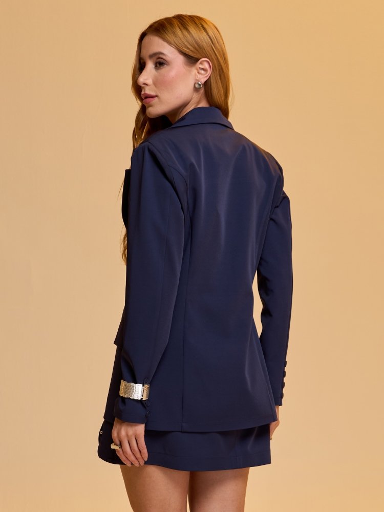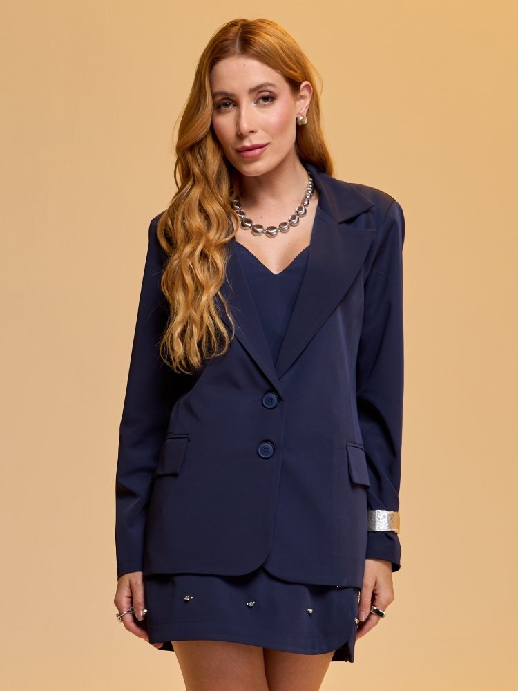 O Blazer Prada traduz sofisticação em cada detalhe. Confeccionado em tecido de alfaiataria Prada com elastano, apresenta caimento impecável aliado ao conforto. A modelagem reta com ombreiras estruturadas garante imponência, enquanto os botões personalizados reforçam o toque exclusivo e refinado da peça. Versátil e elegante, é a escolha ideal para elevar produções do dia a dia ou compor looks poderosos em ocasiões formais, combinando perfeitamente com calças de alfaiataria ou vestidos minimalistas.