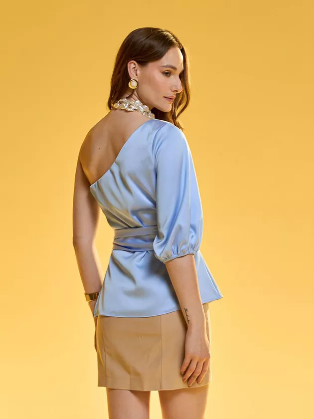 Confeccionada em tecido plano acetinado, essa blusa com modelagem assimétrica é a peça ideal para composições modernas e elegantes. A cintura marcada e a manga bufante trazem um toque sofisticado, enquanto a amarração na cintura e a abertura em zíper garantem um ajuste perfeito. Ideal para eventos especiais ou produções mais ousadas, essa blusa pode ser combinada com saias ou calças de cintura alta para um visual contemporâneo e feminino.
