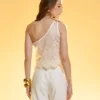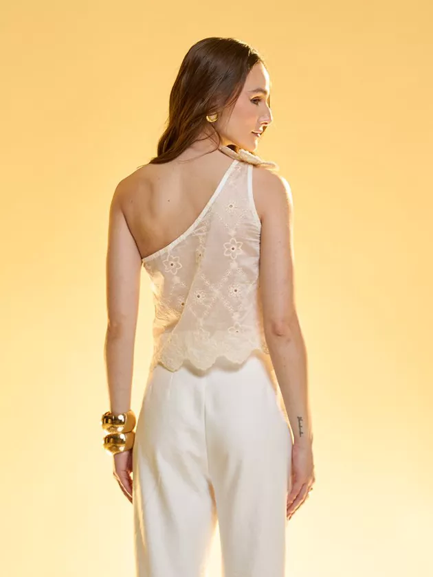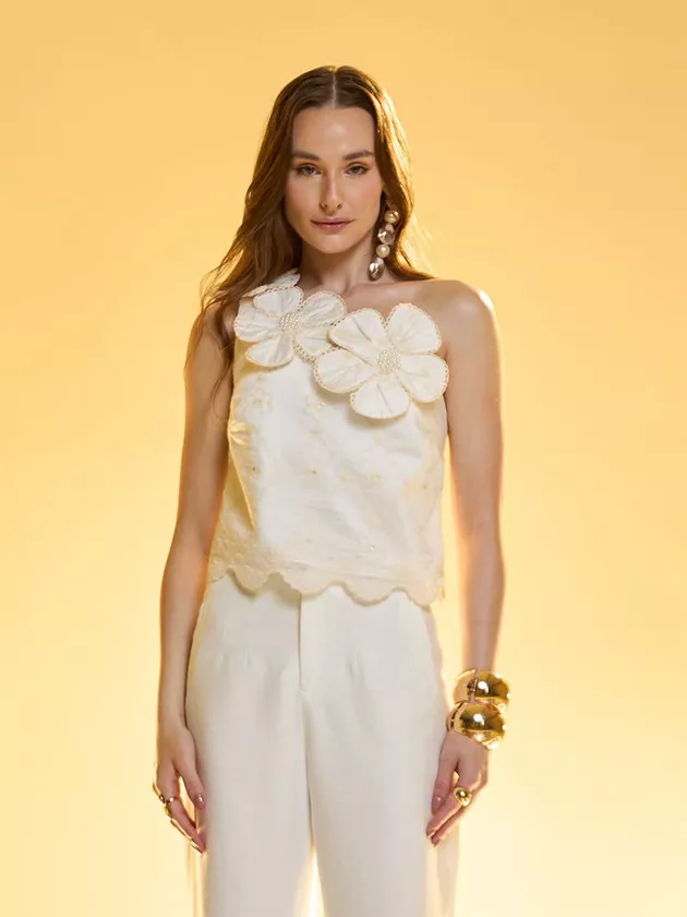 Confeccionada em voil bordado, essa blusa de um ombro só é uma peça moderna e sofisticada. As aplicações de flores oferecem um toque romântico e ao mesmo tempo ousado, tornando essa peça ideal para composições noturnas ou eventos especiais. A modelagem assimétrica é tendência e garante um visual marcante. Combine com saias ou calças de cintura alta para um look equilibrado e cheio de estilo.