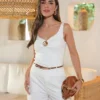 Blusa justa com metal assimétrico no centro do peito. Confeccionada em malha canelada, essa blusa justa oferece um ajuste confortável ao corpo, destacando as curvas com elegância. O detalhe em metal assimétrico no centro do peito é o grande diferencial da peça, adicionando um toque de modernidade e sofisticação. O design foi pensado para possibilitar o uso de sutiã, proporcionando praticidade sem comprometer o estilo. Ideal para quem busca uma peça versátil, que pode ser usada em produções mais formais ou casuais, trazendo sempre um ar moderno ao visual.