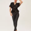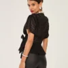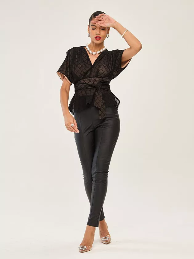Esta blusa possui um zíper lateral, decote em V, cós e faixa para laço na cintura, feita em renda geométrica. Uma peça que combina sensualidade e elegância.