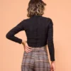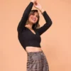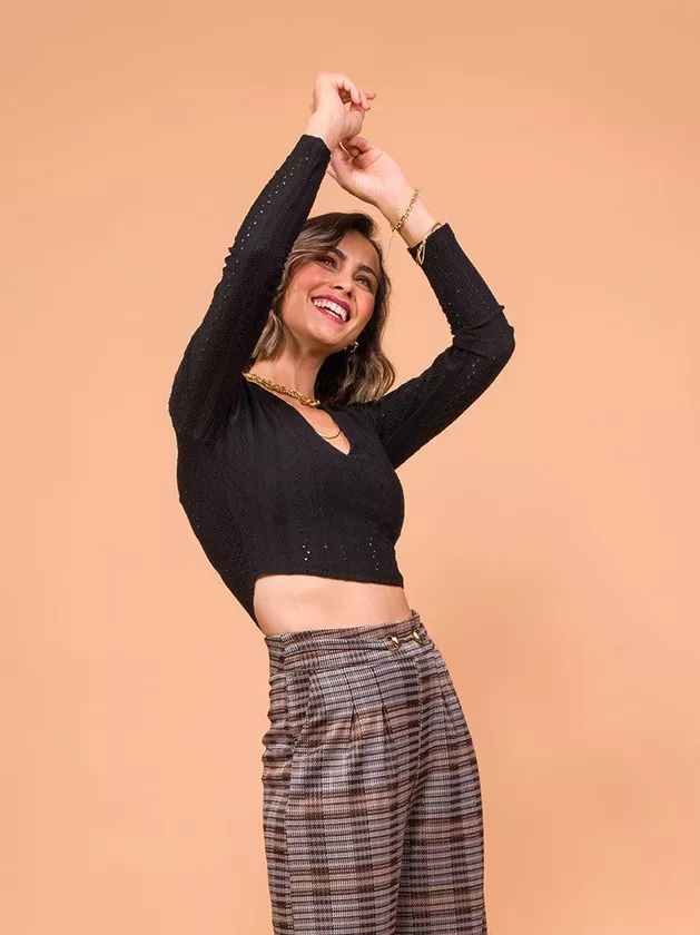 Blusa justa com decote em v. A peça possui modelagem justa e comprimento cropped. Confeccionada em malha laise.