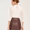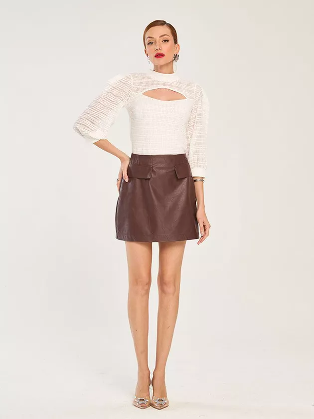 Uma blusa justa com recorte frontal, transparência nas mangas e no recorte do peito. Feita em tule com padronagem geométrica, é uma opção moderna e ousada para looks sofisticados.