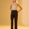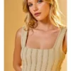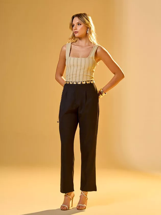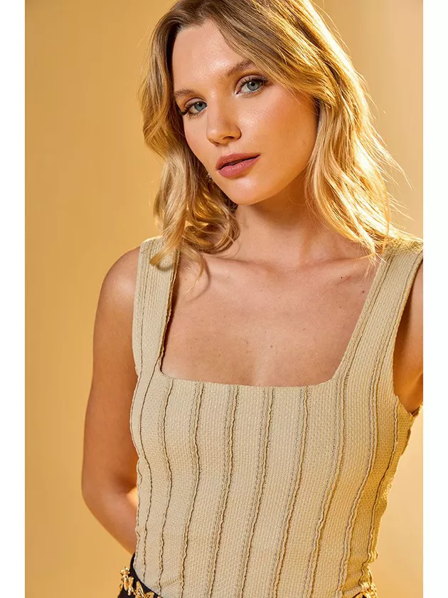 Esta blusa justa apresenta um decote quadrado que oferece uma moldura elegante para o colo, acompanhado de alças largas para um suporte confortável. Confeccionada em malha, a peça garante flexibilidade e um ajuste que abraça as formas, ideal para usar sob jaquetas ou como peça única. Sua simplicidade é contrabalançada pela sofisticação do corte, tornando-a uma base excelente para diversos looks, desde casuais até mais formais.