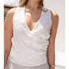 Blusa com transpasse frontal, confeccionada em malha resinada, esta blusa transpassada frontal traz um toque de sofisticação ao seu visual. O decote em V e os detalhes de drapeado criam um shape elegante e moderno, perfeito para realçar a silhueta. Essa peça é ideal para compor looks que vão do escritório a jantares, adicionando um ar de requinte a qualquer produção. A tendência do transpassado é perfeita para quem busca um estilo versátil, permitindo combinações com saias, calças ou shorts. É a escolha certa para quem quer praticidade e elegância, garantindo um visual impecável em todas as ocasiões.