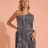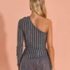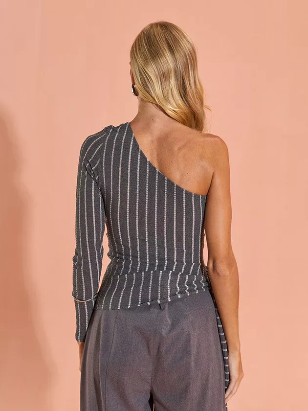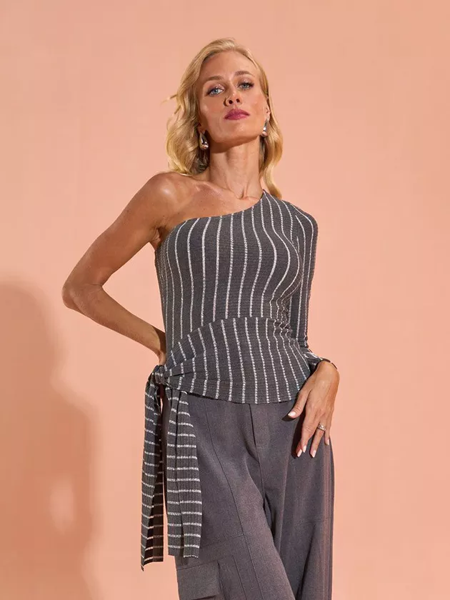 Esta blusa com decote assimétrico redefine a elegância moderna com um toque de originalidade. A manga justa complementa a silhueta refinada, enquanto a amarração na cintura permite ajustar a peça para destacar as curvas de forma sutil e sofisticada. Confeccionada em malha com elastano, garante conforto e flexibilidade, adaptando-se perfeitamente ao corpo. A padronagem listrada, enriquecida com fios de lurex, adiciona um brilho discreto, transformando a blusa em uma opção ideal tanto para o dia a dia quanto para ocasiões especiais. Este design é perfeito para quem busca combinar conforto com um estilo marcante e contemporâneo.