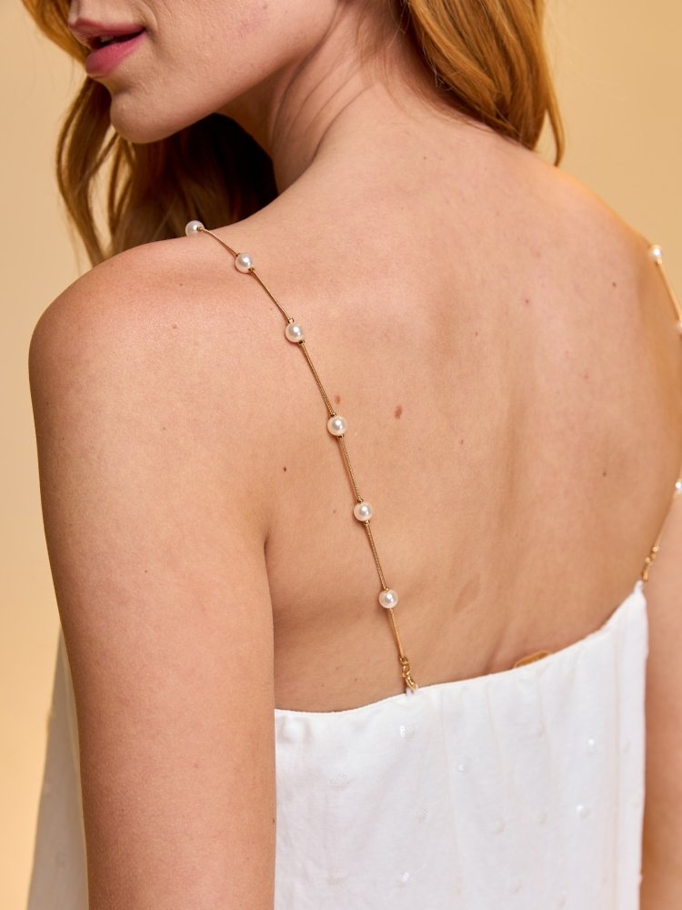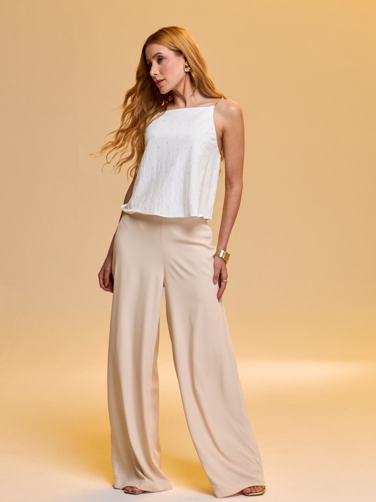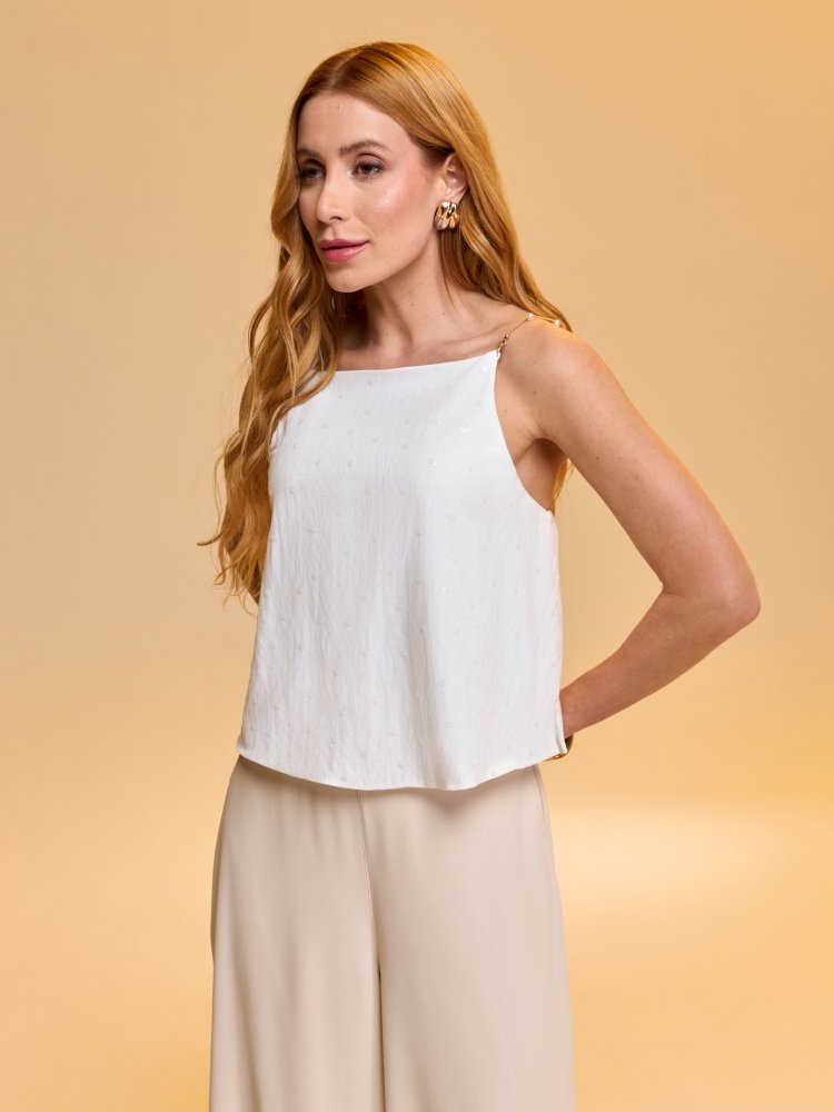 A Blusa Poá Bordado é puro charme em versão sofisticada. Confeccionada em tecido plano de viscose com toque leve, apresenta bordado em paetês que cria um brilho elegante e moderno. O detalhe das alças em corrente adornadas com pérolas transforma a peça em um destaque especial, unindo delicadeza e exclusividade. Ideal para produções noturnas ou eventos refinados, combine-a com saias fluidas para um visual romântico ou com calça de alfaiataria para um look contemporâneo e sofisticado.