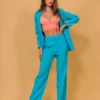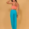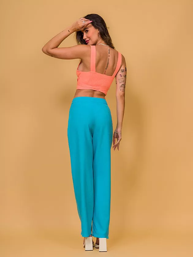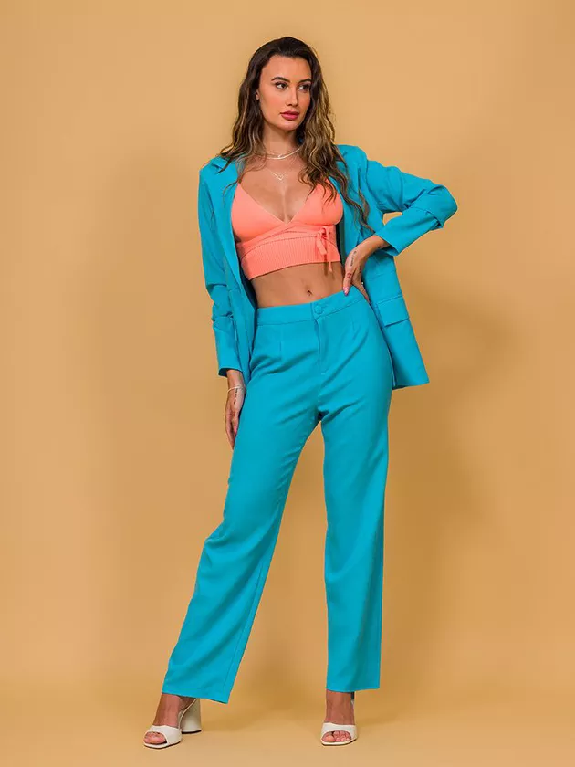 Calça com cintura marcada e modelagem reta. A peça possui cós com botão. Confeccionada em alfaiataria com textura de linho.