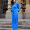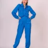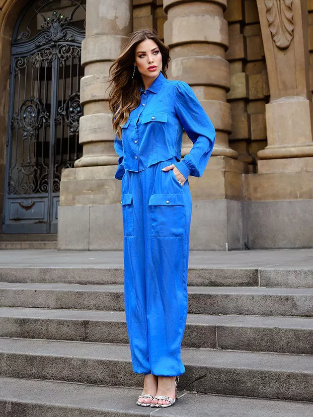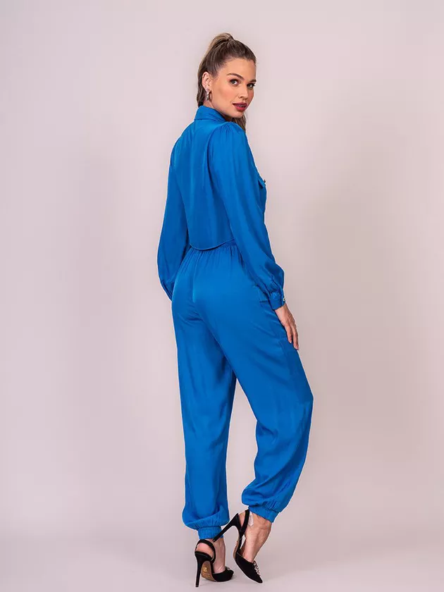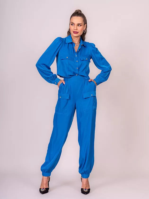 Calça jogger com modelagem solta, cós de elástico com leve franzido, bolsos laterais e frontais com lapela e botões de joia, elástico no punho da calça somente na parte de trás. Confeccionado em viscose acetinada.