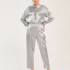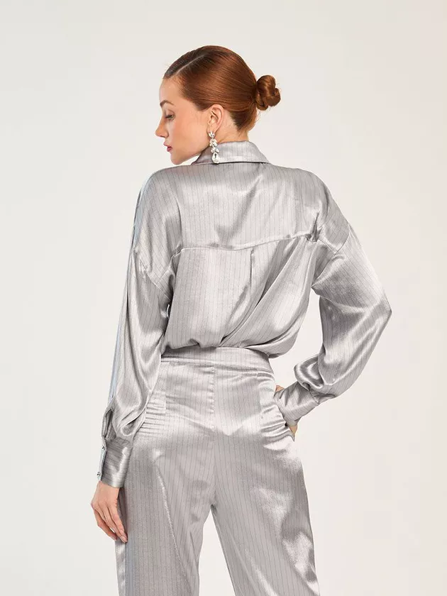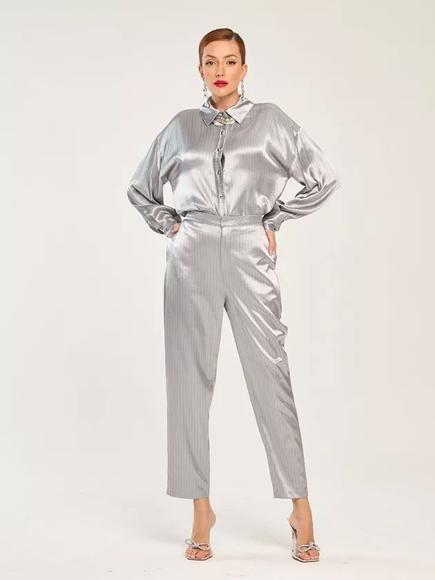 Uma calça de alfaiataria com bolsos embutidos laterais, colchetes e botão interno. Feita em viscose acetinada, proporciona elegância e conforto.