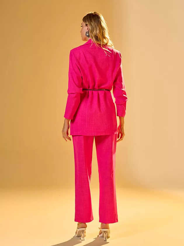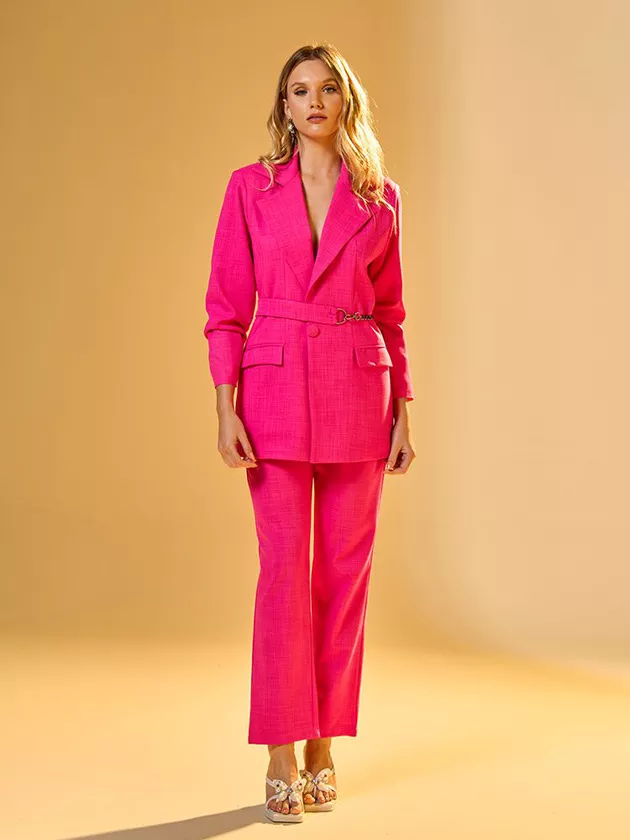 Esta calça reta oferece um perfil clássico com um toque moderno. Confeccionada em poliéster com textura de linho, apresenta um cós cuidadosamente desenhado para um ajuste confortável e um fechamento com zíper e botão forrado que enriquece a peça. Sua versatilidade permite inúmeras combinações, tornando-a ideal para ambientes de trabalho ou ocasiões formais. A peça une a praticidade do poliéster com a elegância de uma textura que remete ao linho, garantindo durabilidade e facilidade de manutenção.