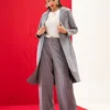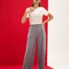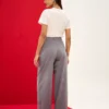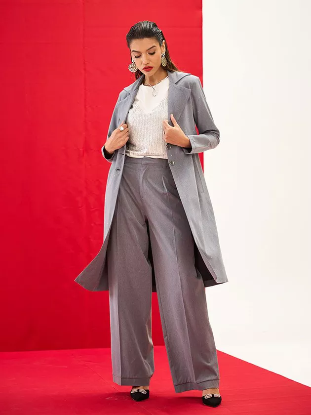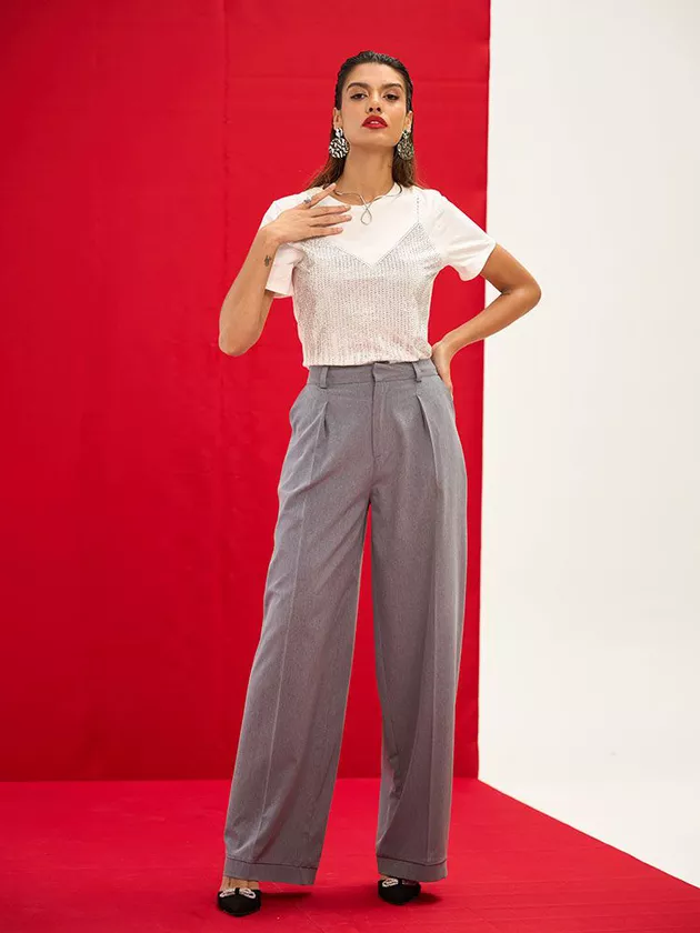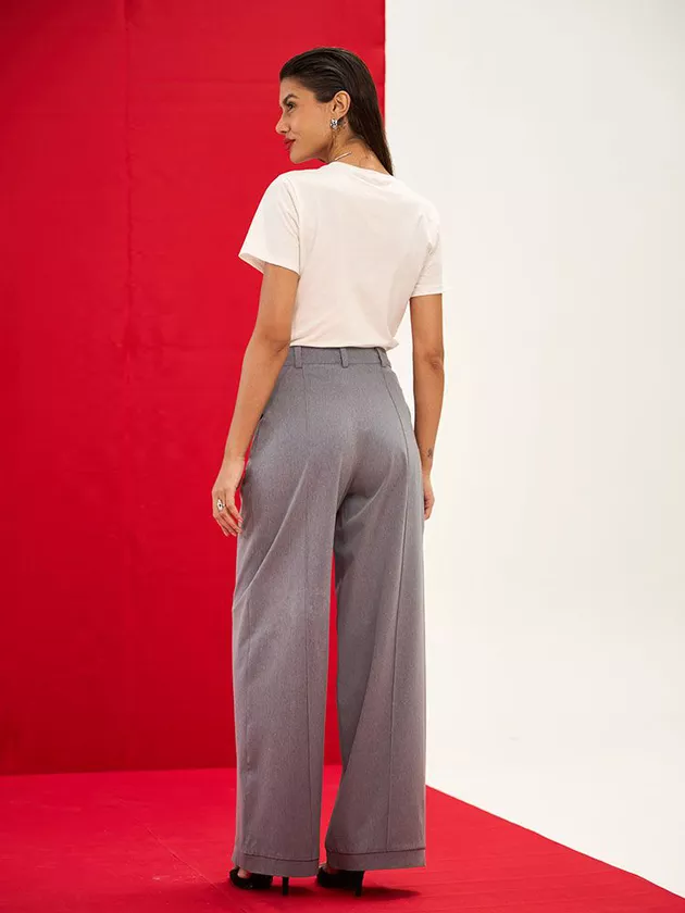 Calça wide leg que combina conforto e sofisticação. Possui abertura frontal com cós e botão, além de pregas e passantes para um toque extra de elegância. Confeccionada em tecido de alfaiataria, é ideal para looks contemporâneos.