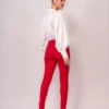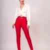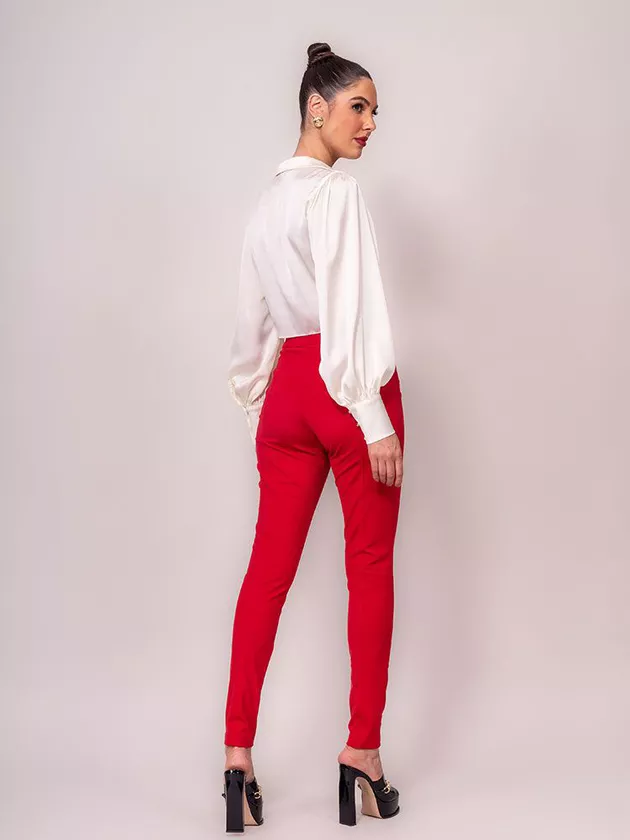 Calça com modelagem justa, cós diferenciado com detalhe em metal. A peça possui cintura marcada e abertura em zíper na lateral.