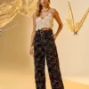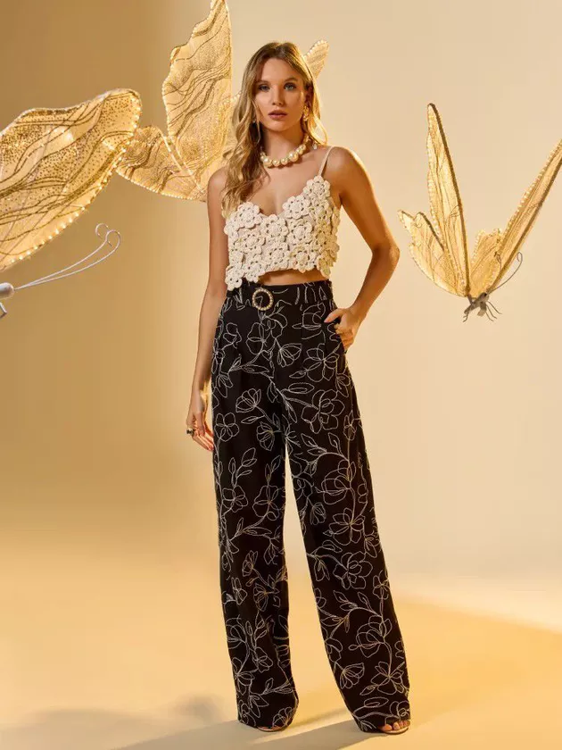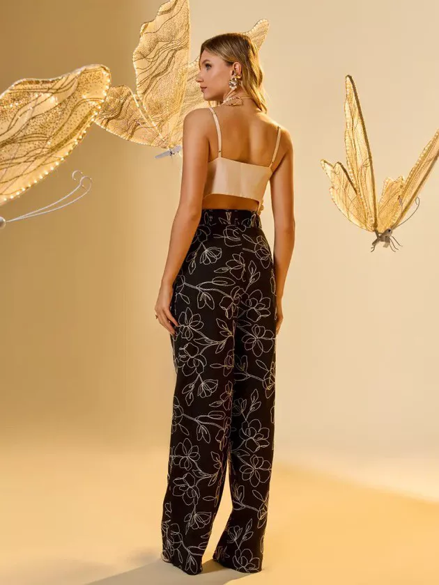 Exiba elegância fluida com nossa calça wide leg, ornada com um cinto de fivela trabalhada em pérolas. Confeccionada em alfaiataria de viscose bordada, esta peça apresenta um padrão floral vibrante que celebra a feminilidade e a beleza. O corte amplo garante movimento e conforto, enquanto o detalhe do cinto adiciona um foco sofisticado na cintura. Perfeita para combinar com uma blusa de seda ou um top ajustado, esta calça é ideal para ocasiões que pedem um visual chique e marcante.