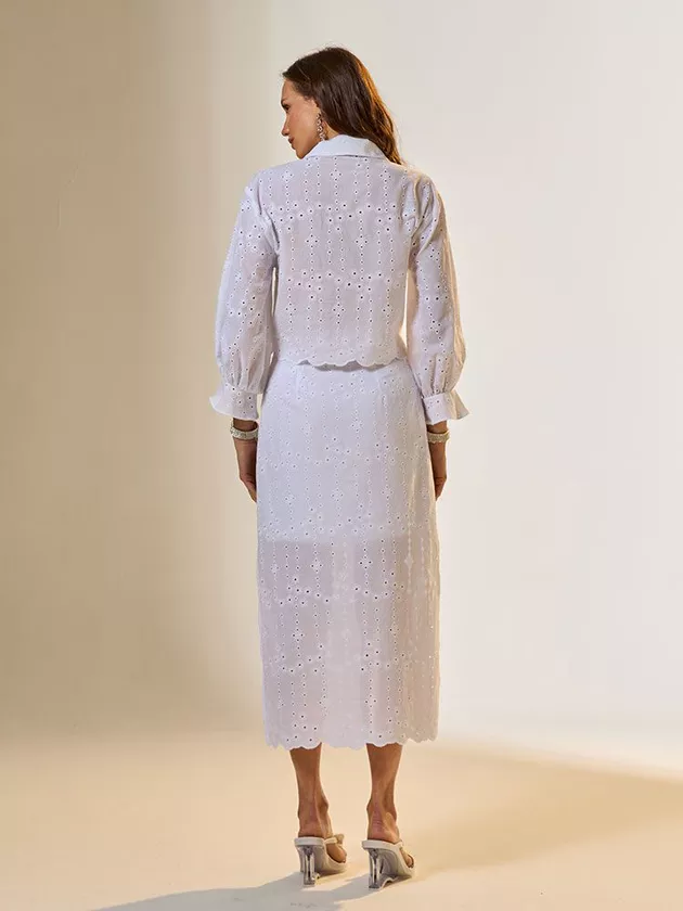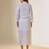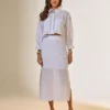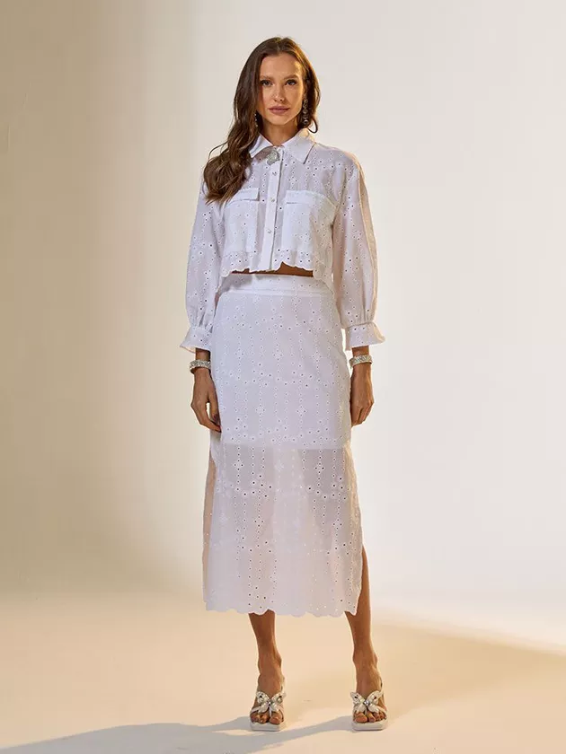 Esta camisa de comprimento médio, confeccionada em laise, é a definição de elegância suave. O acabamento em barrado junto com a abertura com taco oferece um visual tradicional renovado, ideal para ambientes formais ou como uma peça elegante para o dia a dia. Sua textura delicada e design fluído proporcionam um toque de feminilidade e classe, adaptando-se facilmente a várias combinações de moda.