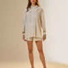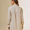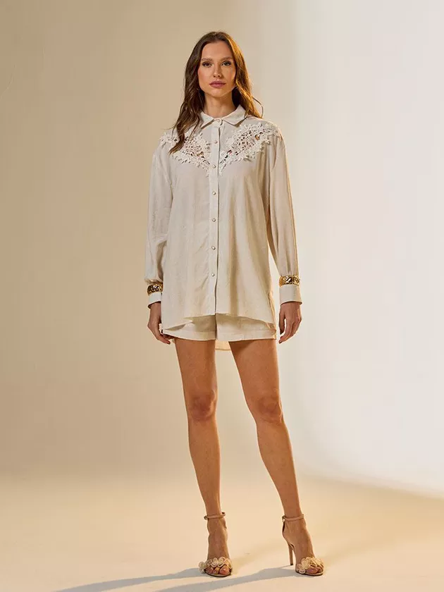 Exiba um visual delicado e sofisticado com nossa camisa de modelagem solta. Confeccionada em viscose com textura de linho, esta peça apresenta detalhes encantadores em renda vazada, oferecendo um toque feminino e elegante. A abertura frontal com taco e botão permite um fechamento prático, enquanto o estilo solto garante um caimento fluido e confortável, ideal para combinar com jeans ajustados ou saias midi.