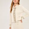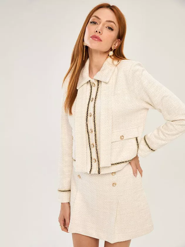 Explore o charme irresistível do nosso Casaqueto com modelagem slim, uma peça que une elegância e modernidade em cada detalhe. O guipir delicado e a gola de amarração solta adicionam um toque de sofisticação, enquanto os bolsos com lapela e os botões em metal de pérola elevam o estilo a um novo patamar. Confeccionado em malha tweed de alta qualidade, este casaqueto é mais do que uma peça de roupa, é uma expressão de seu estilo único. Vista-se com distinção e destaque-se com esta escolha impecável.