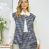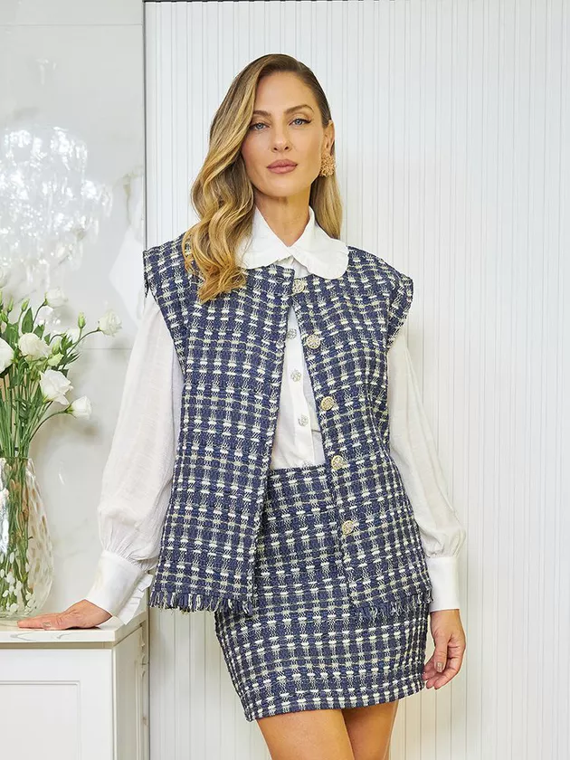 Elevando o clássico, nosso Colete Oversized em Tweed redefine o luxo casual. Com uma abertura frontal e botões encrustados de strass metálicos, esta peça traz um brilho sutil e um toque de irreverência ao seu guarda-roupa. O tweed, material tradicionalmente elegante, ganha um ar moderno na modelagem oversized, perfeito para sobrepor qualquer outfit e adicionar uma camada extra de estilo e personalidade.