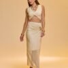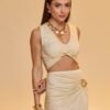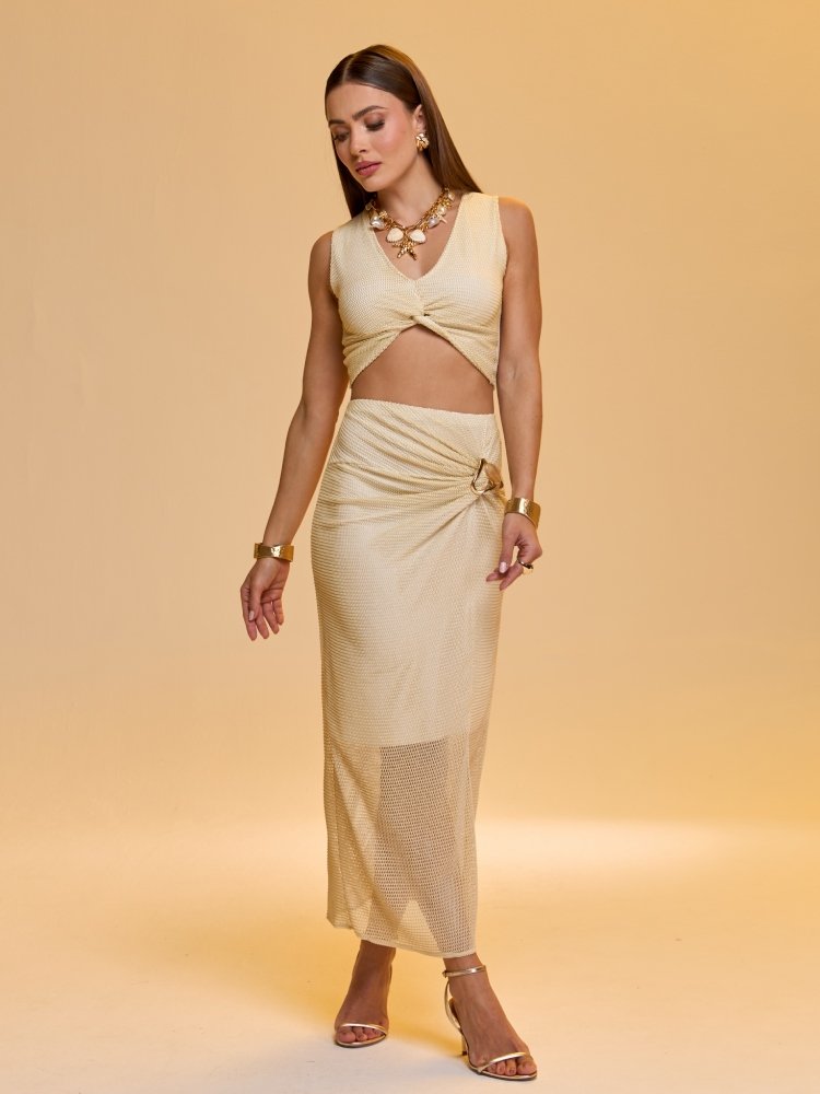 O Conjunto Loren traduz modernidade e sofisticação em uma proposta única. Confeccionado em malha tricot com lurex dourado, entrega brilho sutil e caimento elegante. O top com torção frontal valoriza o busto com delicadeza, enquanto a saia traz detalhe em nó com metal, realçando a silhueta com um toque de design exclusivo. Perfeito para ocasiões especiais, pode ser usado com sandálias de tiras finas e clutch minimalista, criando uma produção impactante para festas, jantares ou celebrações noturnas.