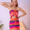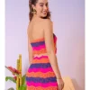 Conjunto composto por cropped tomara que caía, detalhe frontal de túnel e amarração com acabamento em pompom. Saia curta com modelagem solta, forro interno do mesmo tecido, cós largo com elástico e detalhe decorativo de amarração frontal. Confeccionado em crochê.