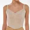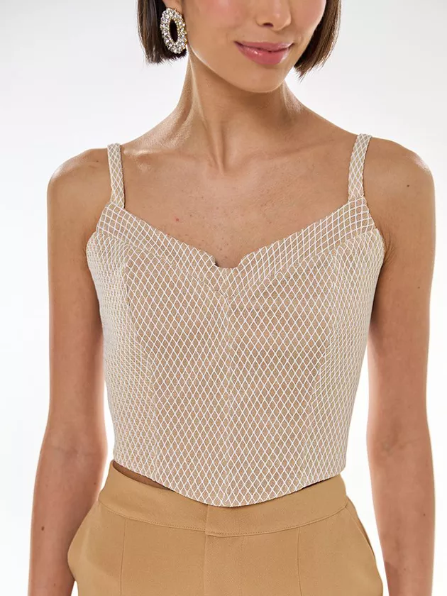 Confeccionado em tule geométrico, esse corselet é a peça perfeita para quem busca sensualidade e modernidade em um só look. As alças reguláveis garantem um ajuste confortável, enquanto o zíper metalizado nas costas adiciona um toque de estilo urbano e contemporâneo. O tecido geométrico traz um ar moderno e diferenciado à peça, que pode ser usada tanto sozinha em ocasiões mais ousadas quanto em sobreposições para um look mais elaborado.