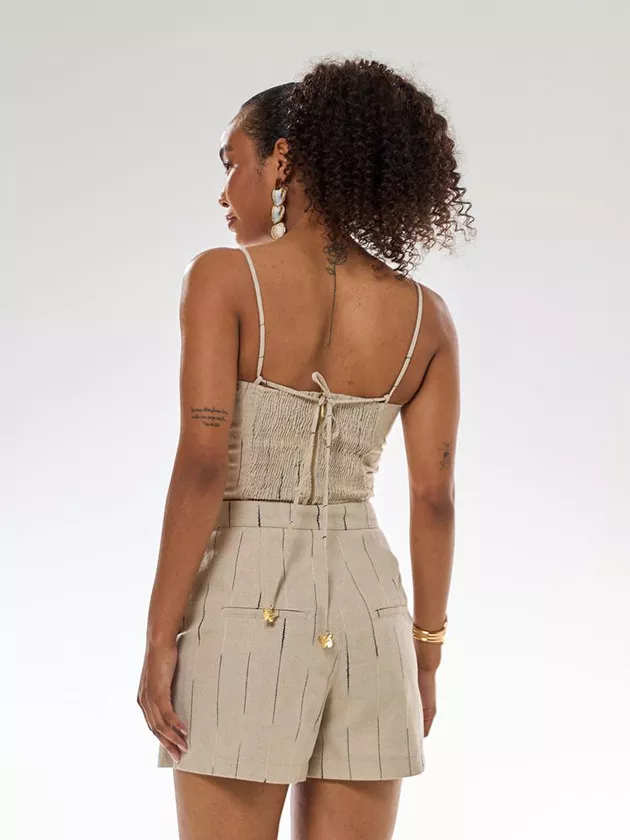 Esse cropped de linho com padronagem de listras é a escolha certa para quem busca um look leve e sofisticado. O recorte no peito proporciona um caimento ajustado, enquanto as alças reguláveis, o lastex e o zíper metalizado nas costas garantem conforto e praticidade. Ideal para dias mais quentes, essa peça pode ser combinada com saias ou calças de cintura alta para um visual moderno e romântico.