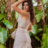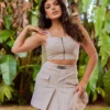Este cropped, possui zíper frontal e recortes estratégicos, estilo corselet, que destacam e moldam a silhueta. Confeccionado em linho com uma padronagem listrada, esta peça combina textura e estilo, perfeita para momentos de ousadia chique.
