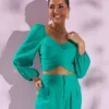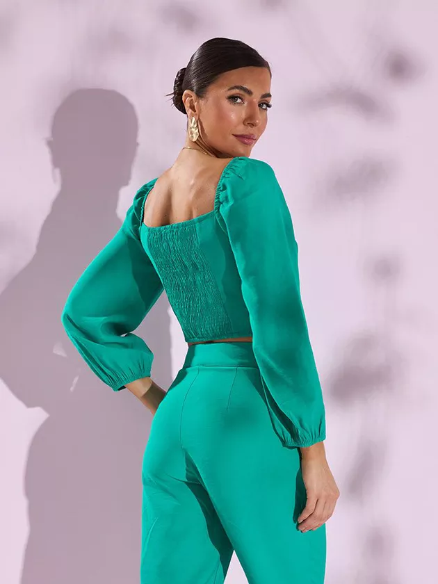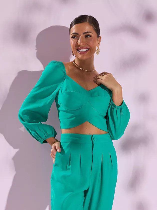 Cropped decote princesa com recorte transpassado frontal, o modelo possui zíper lateral e lastex costas. Confeccionado em alfaiataria twill. Eles trazem características bem específicas já que possuem mangas, mesmo tendo a “barriga de fora” como principal característica, bem como um decote princesa super cool e o lastex nas costas proporciona conforto na hora de produzir os looks.