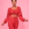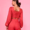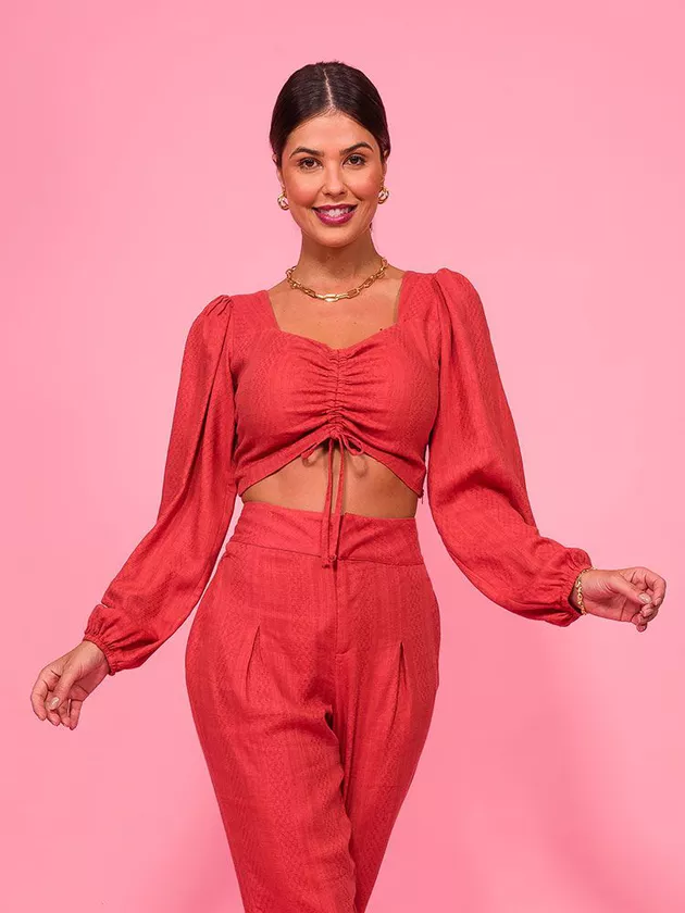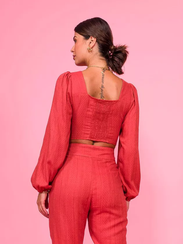 Cropped com modelagem decote princesa. O modelo possui detalhe de túnel com viés para amarração frontal. Mangas bufantes com elástico de 1cm no punho. E lastex nas costas para maior conforto. Confeccionado em base de linho e viscose com textura no tecido.