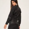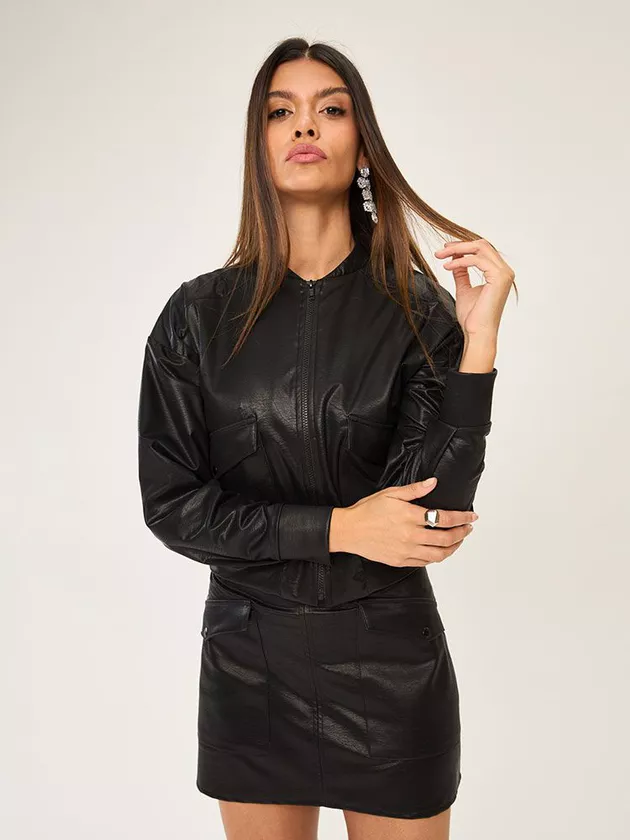 Esta jaqueta é uma declaração de moda. Com detalhe frontal com bolso maxi, abertura em zíper dentado, punho e gola padre, é feita em couro sintético para um visual ousado e contemporâneo.