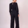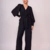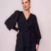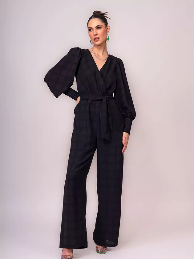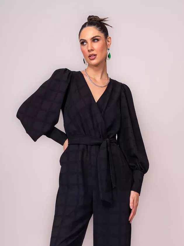 Macacão confeccionado em crepe, tecido leve com caimento e textura com padronagem xadrez..A peça apresenta visual elegante, mangas compridas com franzido e punho largo com botões de metal, decote transpassado e faixa para ajustar a silhueta. Macacão completamente forrado com zíper na lateral e acabamento pespontado.