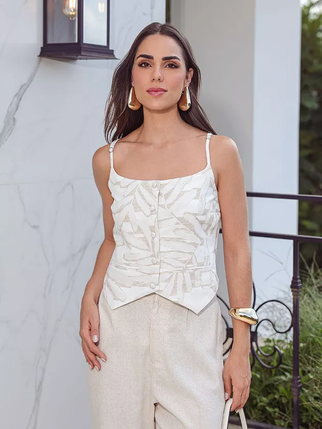 A regata estilo alfaiataria em jacquard de viscose é um clássico reinventado. O tecido com padrão jacquard confere sofisticação e um toque de exclusividade à peça, enquanto os botões frontais trazem um detalhe de estilo que remete à alfaiataria tradicional. A modelagem é delicada e elegante, perfeita para quem busca um visual mais estruturado sem perder a leveza. Ideal para ser combinada com calças de alfaiataria, saias midi ou até com jeans de cintura alta para um look mais casual, a regata traz um toque de classe e modernidade ao visual. Uma peça coringa que é fácil de combinar, sendo perfeita para o trabalho ou para eventos mais formais.