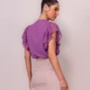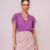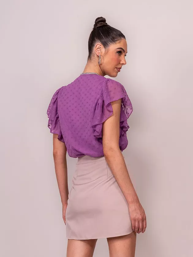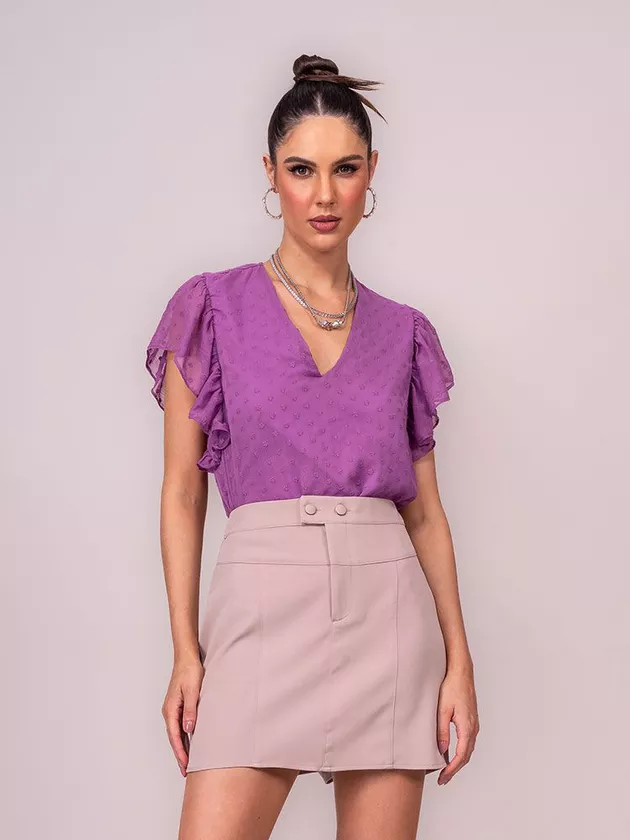 Saia confeccionada em tecido plano. Possui modelagem de alfaiataria, com recortes estratégicos cós com transpasse e botões forrados na mesma cor da peça, fechamento posterior por zíper e acabamento pespontado.
