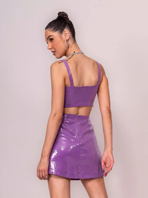 Saia confeccionada em paetê. A peça apresenta modelagem solta com detalhe de pregas na frente proporcionando um visual glamouroso e fashionista. Possui forro embutido e fechamento por zíper nas costas. Caso você não tenha notado, o brilho não vai mais sair do nosso closet, a tendência veio e vai ficar ainda por muitas estações. Eh hora de brilhar, confira as várias produções que fizemos desta peça.