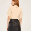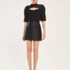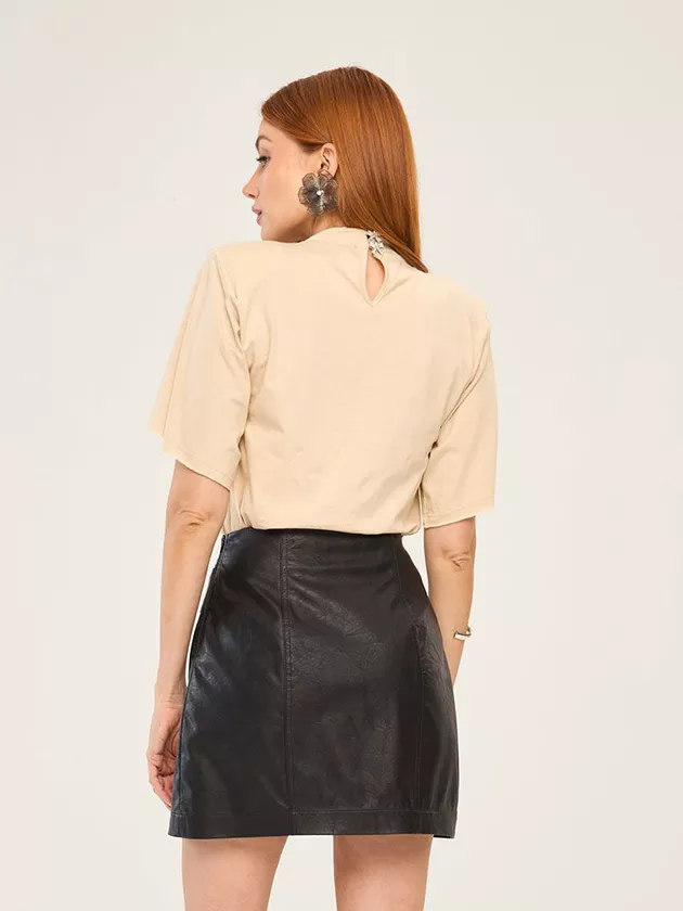 Essa saia curta com detalhes de lapelas frontais e zíper lateral possui recortes traseiros para um ajuste ao corpo. Confeccionada em couro artificial, é uma opção ousada e moderna.