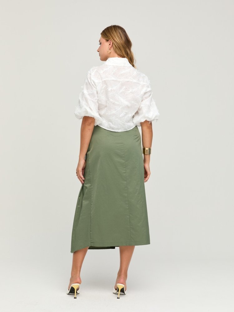 Versátil e elegante, esta saia midi transforma o clássico em uma peça cheia de personalidade. O transpasse frontal com pregas cria um visual dinâmico, enquanto o cós estruturado garante ajuste impecável. Seu tecido em algodão com poliamida proporciona leveza e conforto, ideal para acompanhar a rotina com charme. Use com blusas de tecido leve e sandálias elegantes para compor produções que vão do escritório ao encontro de fim de tarde com naturalidade e estilo.