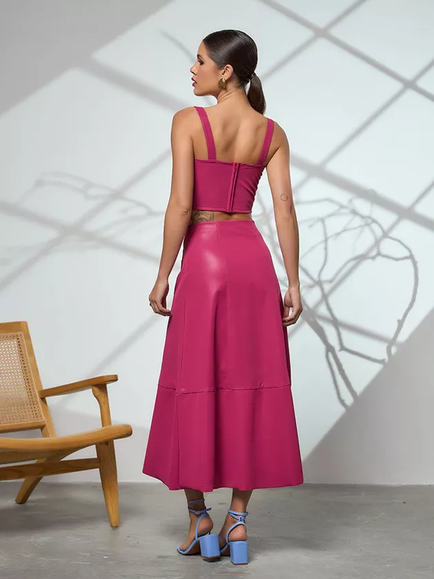 A saia midi com cós de 5 cm é uma peça que traz elegância e sofisticação ao visual. Seu comprimento na altura da panturrilha é perfeito para quem busca um look mais discreto e refinado. A modelagem evasê valoriza a cintura e desenha as curvas do corpo, sendo uma opção versátil para diversas ocasiões. Confeccionada em couro sintético, a saia midi traz um toque moderno e atual ao look. A abertura em zíper na lateral permite maior conforto e praticidade na hora de vestir a peça. Para um look mais formal, combine a saia midi com uma camisa de botões e um blazer. Já para um visual mais descontraído, aposte em uma blusa básica e um tênis ou sapato baixo. Acessórios como colares e brincos podem complementar o look e dar um toque especial à produção.