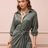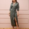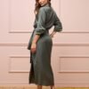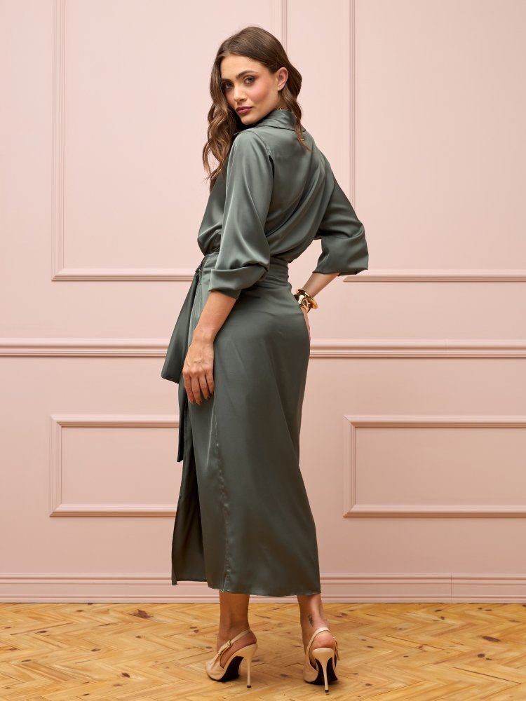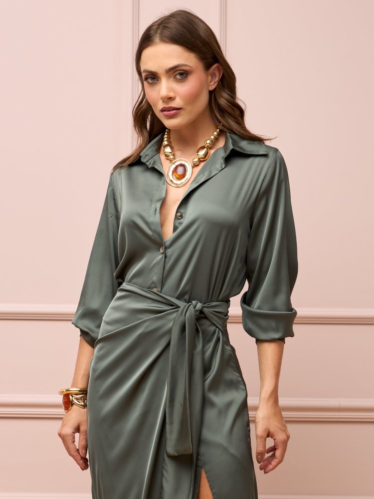 A Saia Midi é a expressão máxima de delicadeza e fluidez. Confeccionada em crepe acetinado com toque de seda, ela entrega um brilho sutil e um caimento que desliza pelo corpo com naturalidade. A modelagem inspirada no estilo envelope ganha vida com a amarração lateral e a fenda interna, detalhes pensados para unir charme e segurança, criando um visual que revela — sem expor — a feminilidade de forma refinada. Cada recorte foi cuidadosamente desenhado para proporcionar leveza, conforto e harmonia ao vestir.
