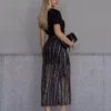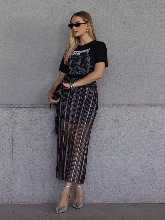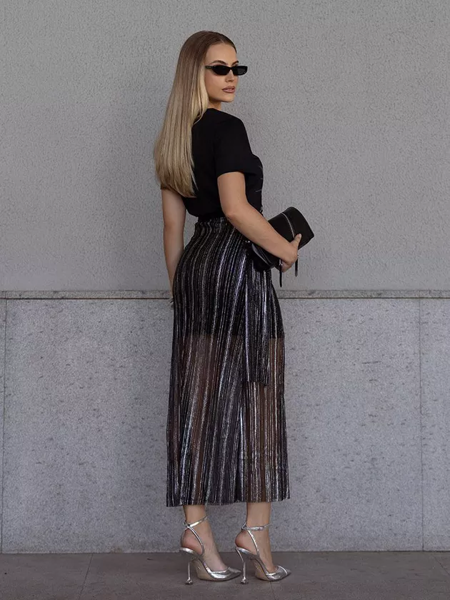 Envolve-se na leveza e no brilho sutíl da nossa Saia Midi Plissada. Com detalhes em folha que capturam a luz de maneira encantadora, esta peça é uma declaração verdadeira. A amarração lateral adiciona um toque de personalidade, enquanto a tule confere uma textura delicada e um movimento perfeito. Esta saia é a escolha perfeita para quem deseja adicionar um toque de brilho aos seus looks, mantendo a elegância e a sofisticação.