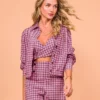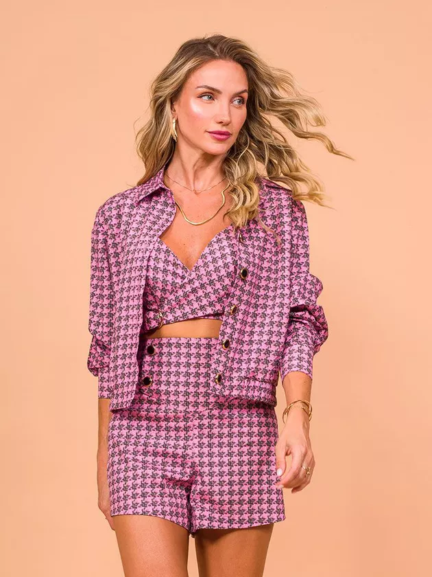 Short com detalhes de botões frontais e zíper lateral. Confeccionado em crepe com estampa de pied de poule.