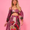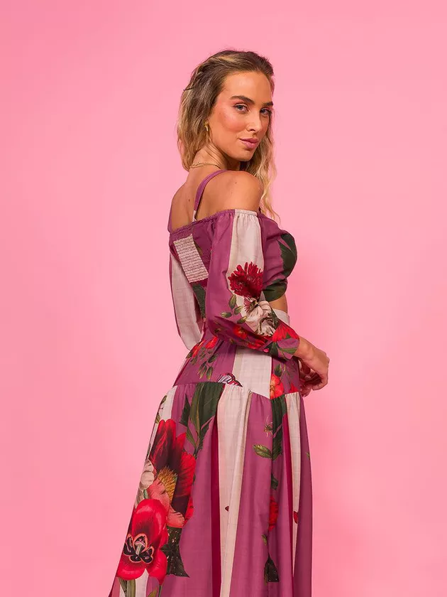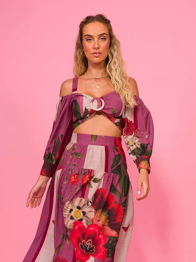 Top cropped com detalhe em argola forrada. A peça possui modelagem justa com mangas em evidência e abertura com ziper na lateral. Estampa exclusiva Flor Linda. Confeccionado em crepe.