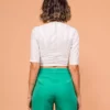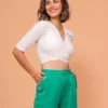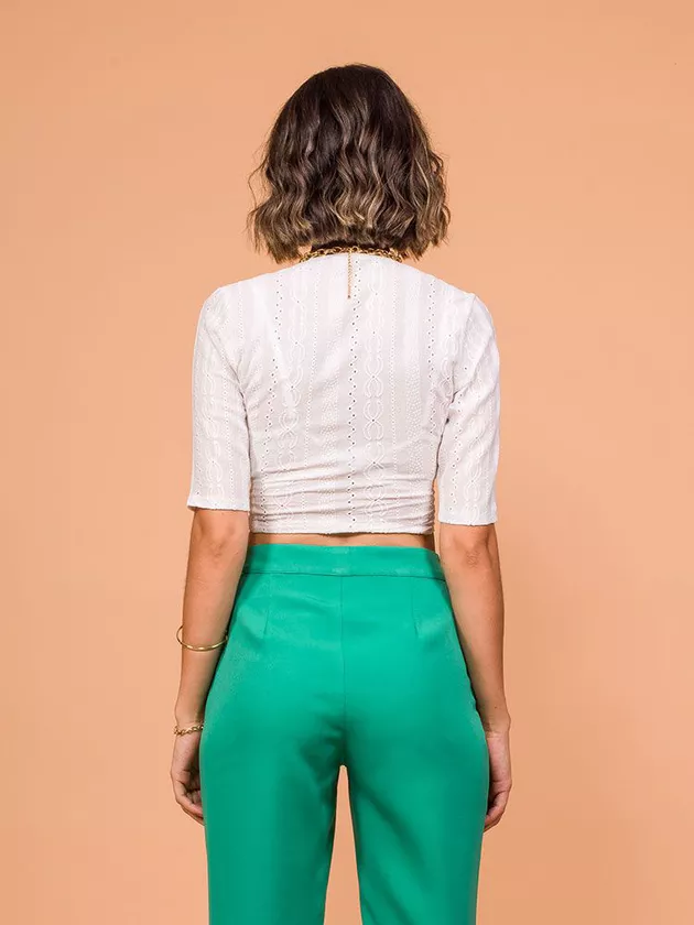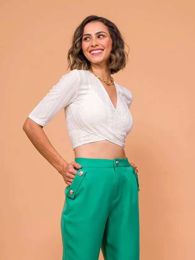 Blusa com modelagem justa e transpasse na frente. Manga justa com comprimento médio. Confeccionada em malha laise.