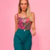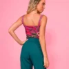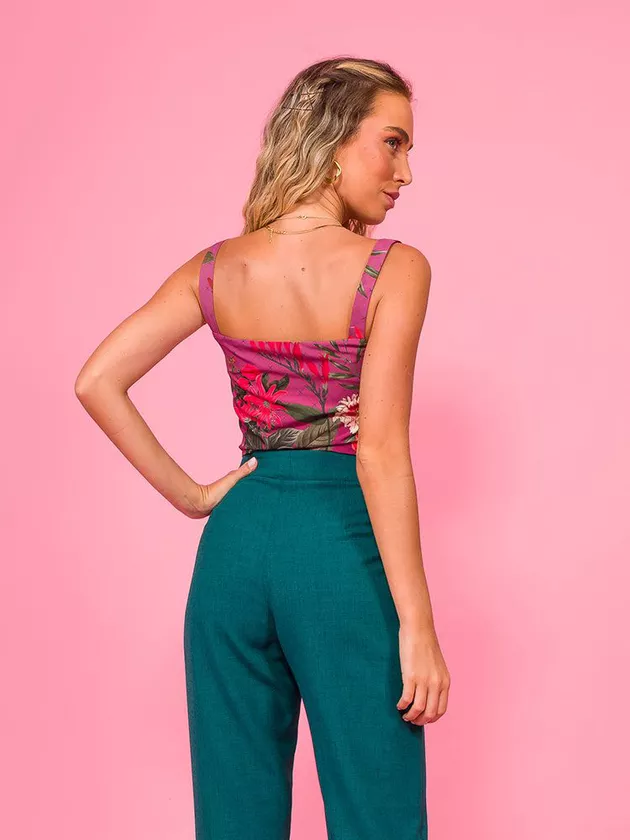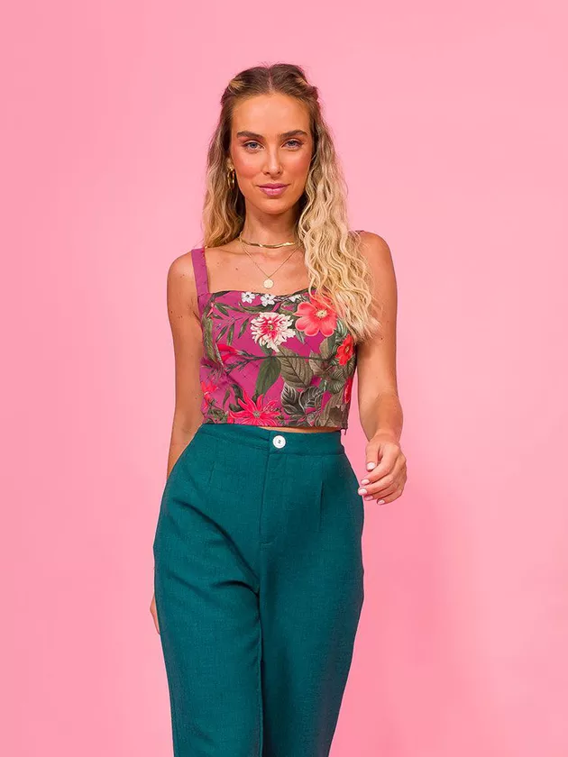 Top cropped com recortes frontais. A peça possui alça larga com ziper na lateral e estampa exclusiva. Confeccionado em Crepe.
