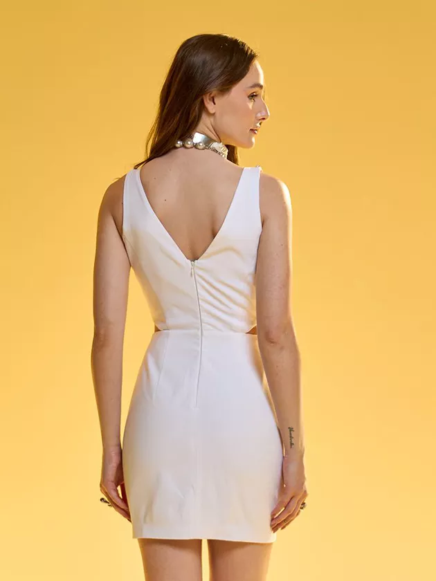 ATENÇÃO: PEÇA SEM O BORDADO NA CAVA. Confeccionado em alfaiataria de viscose, esse vestido curto é uma verdadeira peça statement. O detalhe de flor na cintura, combinado com as aberturas sutis nas laterais e o decote em V, valoriza a silhueta de forma sofisticada e feminina. Perfeito para ocasiões especiais ou eventos casuais chic, esse vestido pode ser combinado com acessórios minimalistas para um visual equilibrado.
