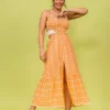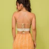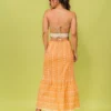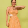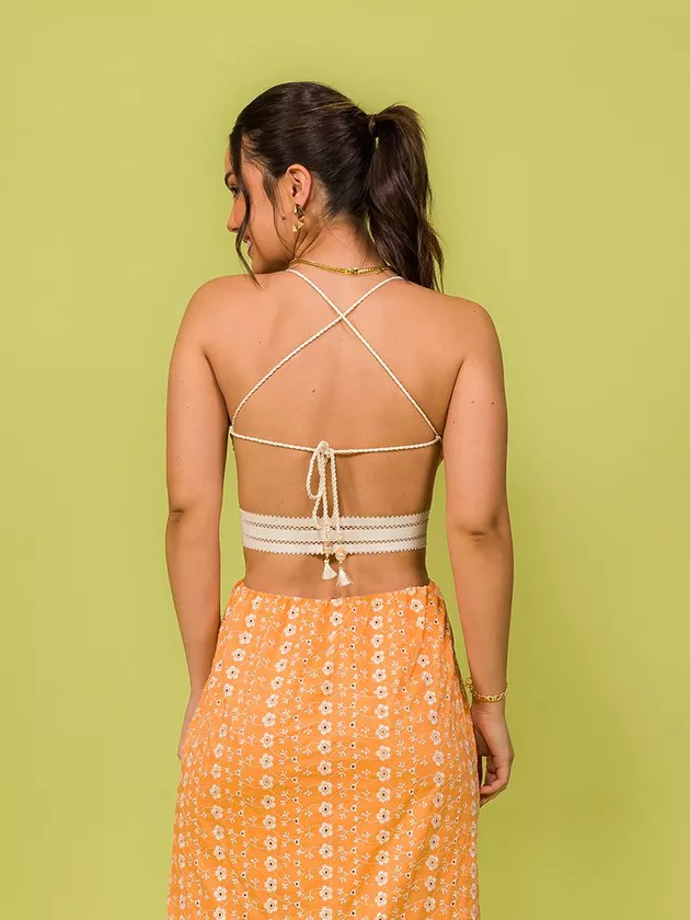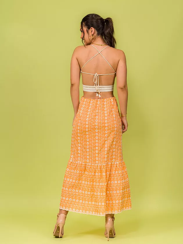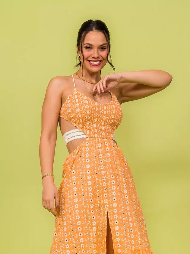 Vestido mídi com peito em lastex e ajuste nas costas com ponteiras. O modelo possui elástico decorativo da cintura e foi confeccionado em laise de algodão.