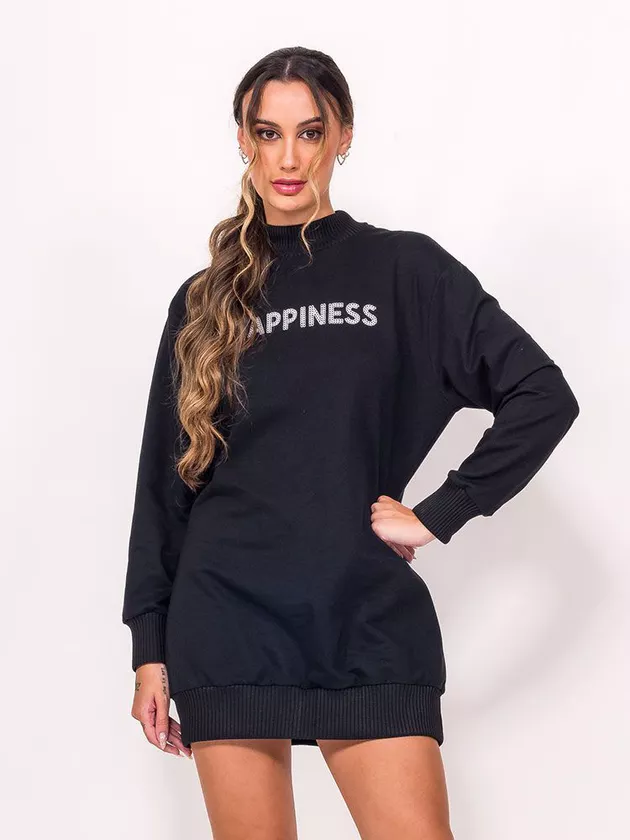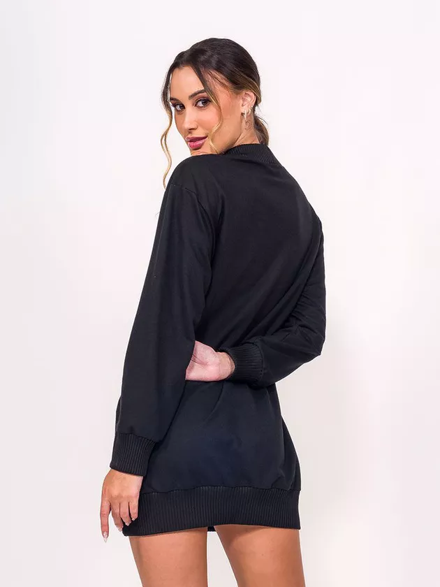 Vestido com bordado de linha localizado frontal. O modelo possui acabamentos em ribana e foi confeccionado em moletinho.