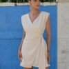 Este vestido mini confeccionado em crepe leve traz movimento e elegância em cada detalhe. O design com transpasse e amarração na lateral cria um caimento feminino e ajustável, enquanto o ombro deslocado com franzido adiciona charme e delicadeza ao visual.