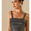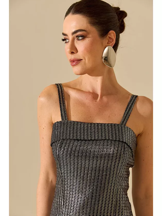 Confeccionado em tela metalizada de alta qualidade, este vestido mini combina modernidade e ousadia em um design sofisticado. A modelagem justa valoriza a silhueta, enquanto os recortes estratégicos adicionam um toque de sensualidade e estilo. As alças largas garantem conforto e suporte, equilibrando o visual com elegância. Perfeito para eventos noturnos, festas ou ocasiões especiais, este vestido é uma peça statement que se destaca em qualquer produção. Combine com acessórios minimalistas e salto alto para criar um look impactante e cheio de personalidade. Uma escolha ideal para quem busca brilhar com atitude e sofisticação.