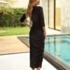 Este vestido midi justo captura a essência da sofisticação moderna com seu detalhe franzido e um toque de metal que eleva o estilo. As mangas ¾ e a modelagem ajustada proporcionam uma silhueta elegante e contemporânea. Confeccionado em malha, é confortável e estiloso, perfeito para reuniões de negócios ou eventos formais onde a elegância é essencial.