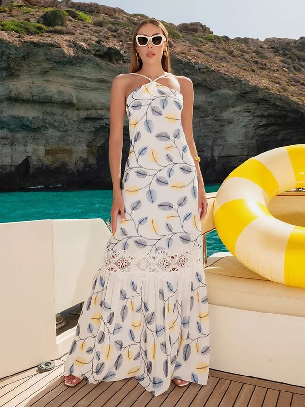 Confeccionado em viscose com estampa de folhas, esse vestido longo com modelagem em A é perfeito para quem busca um look leve e elegante. As alças com reguladores garantem um ajuste confortável, enquanto o detalhe de guipir vazado traz um toque de sofisticação ao visual. Ideal para eventos diurnos ou casuais chic, essa peça combina perfeitamente com rasteirinhas ou sandálias delicadas.